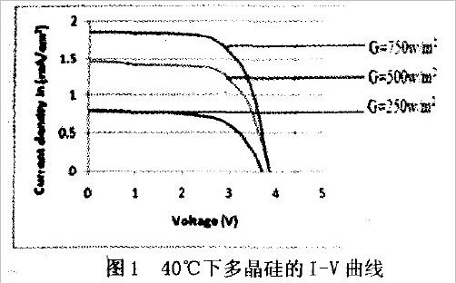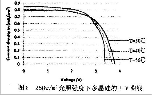 如图1所示,对于多晶硅而言在相同的温度下,更高的光照强度产生的电流强大越大。但不难看出,不同这时不同的光照强度对电压的变化影响很小。从图2可以看出,相同日照强度下,温度变化对I-V曲线的影响非常有限。