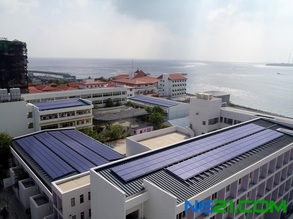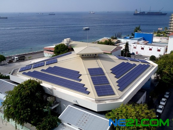 此次采用了210W型太阳能电池组件,一期共安装了1,896块,二期计划安装1,344块。另外,鉴于马尔代夫地处台风多发地区,为了承受强风等侵袭,特意将太阳能电池的背面用支撑杆固定,提高了抗风性能。