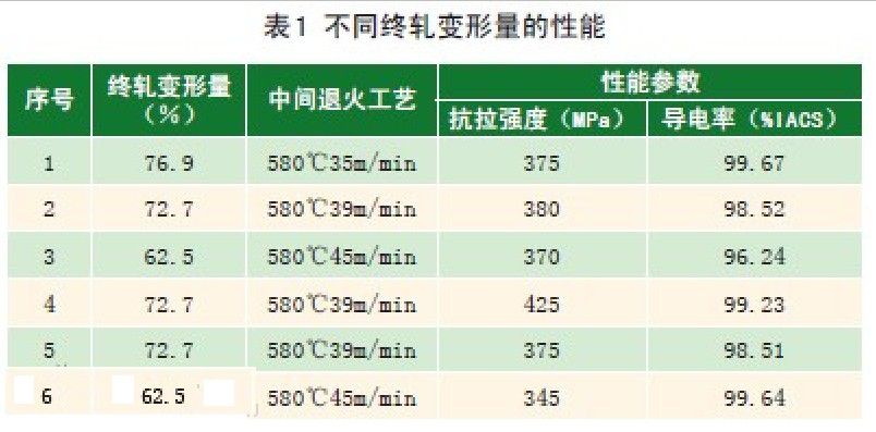 根据抗拉强度与变形率关系和导电率与变形率关系,初步确定采用60%~75%的变形量,分别用两种终轧变形量生产了6批产品。
