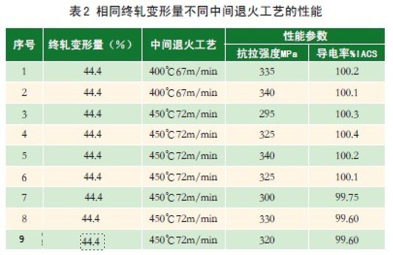 试制中存在的问题:硬态和抗拉强度符合要求,但导电率低;软态成品退火后,硬度偏高(HV0.2>50),抗拉强度符合要求(>240MPa)。硬度达到要求(HV0.2<50),抗拉强度偏低(230MPa)。保证带材有较高的强度和较低的硬度,需要控制好冷轧变形和热处理参数,确定出最佳的形变热处理参数。