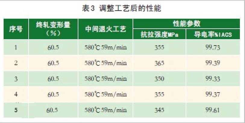 结合试制和检测数据,抗拉强度稳定在320MPa以上且导电率大于98%IACS,终轧变形量最好在60%~70%之间,中间退火温度采取580℃。按此思路,又试制5批,抗拉强度在345MPa~365MPa之间(见表3)。