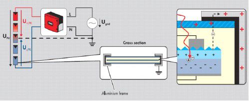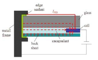 索比光伏网讯:电位诱发衰减(PID)测试PotentialInducedDegradation(PID)ofC-siPVModules国家光伏质检中心CPVT推出PID测试证明服务在电站实际运行中发现,光伏发电系统的系统电压对基于由丝网印刷的晶体硅太阳能电池所构成的光伏组件(上表面为玻璃)有持续的“电位诱发衰减”作用,严重时会导致功率衰减50%以上,一方面影响电站的实际发电量和投资者的收益,另一方面也会让生产企业遭遇质量投诉,影响自己的品牌和声誉。实际研究表明,电池与封装材料(EVA和玻璃的上表面)和组件边框形成的持续性漏电流被认为是直接诱发原因,如图1、2所示。