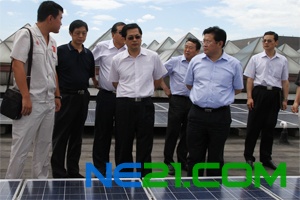 孙华山现场观看屋顶太阳能发电装置、太阳能热水和LED路灯等节能改造项目。