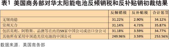 5月18日美国商务部宣布对中国输美太阳能电池(包括采用中国太阳能电池的其它国家太阳能模组)征收31.14%至249.96%的高额反倾销税(表1)。这一初裁立即在中国光伏业界引起强烈反响。天合太阳能老总高纪凡在接受电话采访时直呼:“太高了,完全不能接受!”尚德电力老总施正荣表示裁决不公正但同时表示将积极和美方斡旋,争取调解。尚德电力是目前中国唯一在美国设厂的大型光伏厂商,这一表态也在情理之中。一向低调的阿特斯太阳能也公开表示反对,称这一裁决将使中国光伏产品在美市场的优势荡然无存。