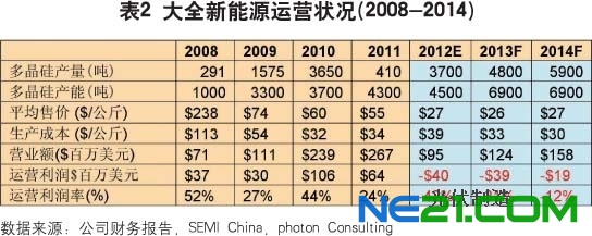 需求不振,从模组到多晶硅的价格也就失去了回稳和反弹的基础。以多晶硅价格为例,目前维持在27~28美元/公斤的长约价格和22~23美元/公斤的现货市场价格在今年下半年要反弹到大约35美元/公斤以上的可能性微乎其微。因此,对于众多生产成本在30-35美元/公斤的中国厂商来说,关闭工厂成了必然的选择。当然,市场需求(包括价格)和生产成本并不是决定企业生死存亡的唯一因素。中国一些有大型国营和民营集团背景的多晶硅厂商有可能通过母公司或者银行的财政支持,在亏本的情况下继续维持一段时间,关键是亏本经营的时间可以维持多久?表2显示了大全新能源自2008年以来的运营状况以及一些机构的预测。这一预测显示,大全新能源在未来2~3年里有可能一直处于亏损状态,除非市场出现戏剧性好转。公司的市场和经营战略转型看来不可避免。