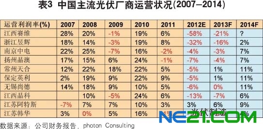 中国绝大多数多晶硅厂商前景暗淡,那么硅片、电池片、模组等下游厂商的状况又如何呢?从去年第二、三季度开始,中国主流的光伏厂商的运营就已经开始出现赤字,而且亏损的严重程度在不断加剧。更为令人不安地是,这些公司的运营状况有可能要一直等到2014年才能有所改善(表3)。中国公司在经历了2009年的低潮之后,托欧洲市场之福,2010年经营状况大幅改善。但盲目地扩大产能、一味追求“高大全”的垂直整合模式迅速导致了全球产能的过剩,这不但在欧美引起了一片抵制中国公司和产品的杂音而且最终还危及了中国公司本身的盈利能力。这大概是再次印证了近20年来制造业的一个“中国现象”—不管什么东西,如果中国人能够大规模地制造了,结果很快变得大家都没钱赚。反过来讲,这大概也算是中国对世界的贡献吧。用一些中国光伏企业老总自己的话来讲,中国人是在(全世界)开拓一个廉价的平民光伏时代。不过我怀疑一旦这个廉价光伏时代真的来了,现在的很多开拓者都将被列入“先烈”的名单了,而未来的市场主宰者将是非常另类的公司。我没有“水晶球”来透析未来,但目前的市场数据表明,中国70-80%的光伏公司在未来2-3年里将难以为继,大量过剩的产能将被浪费,以换取利润的回升,这样少数的幸存者才可以在一个“廉价光伏时代”里继续偷生。