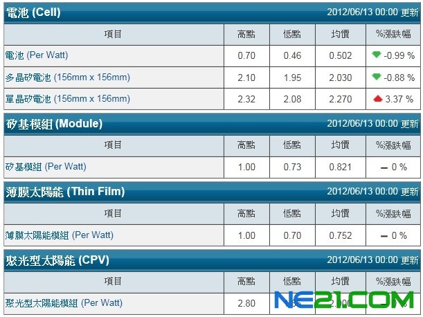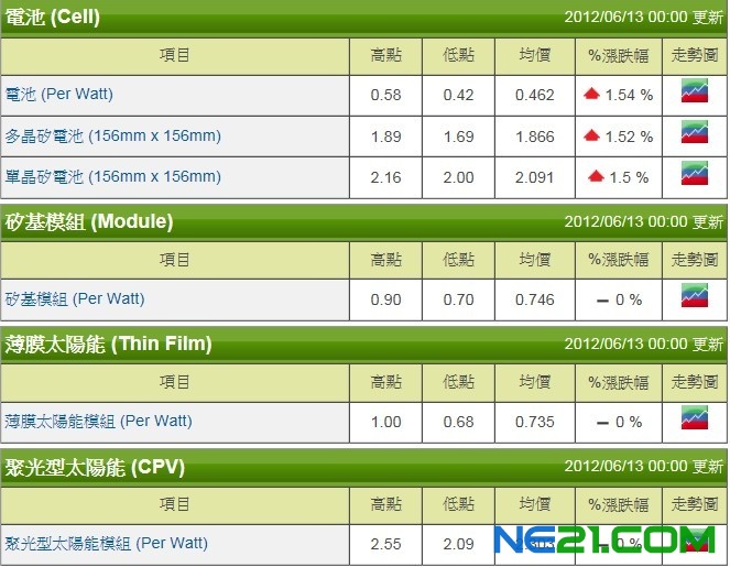 台湾太阳能厂商2012年5月营收纷纷出炉,根据TrendForce旗下新能源分析部门EnergyTrend指出,台厂5月份普遍出货状况理想,产能仍维持在八成以上,电池厂也因美国反倾销初判定案持续接获内地厂商代工订单,并借机将现货报价缓步小幅调涨,连带激励矽外延片产品售价走扬。