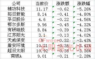 假期之后第一个交易日沪深两市继续低开,截止收盘,今日上证指数报收2224.11点,跌36.77点,跌幅1.63%;深成指报收9414.21点,跌268.48点,跌幅2.77%。板块方面,今日多晶硅板块个股悉数下跌,其中精功科技领跌,跌幅5.26%,拓日新能下跌4.80%。