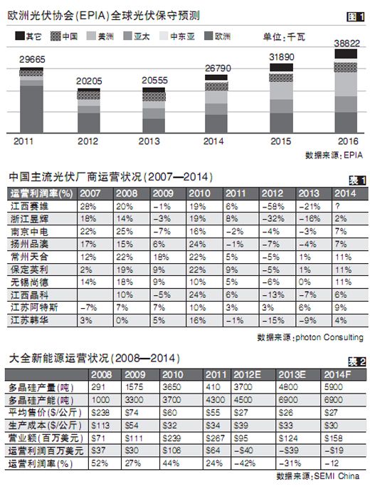 中国绝大多数多晶硅厂商前景暗淡,那么硅片、电池片、模组等下游厂商的状况又如何呢?从去年第二、三季度开始,中国主流的光伏厂商的运营就已经开始出现赤字,而且亏损的严重程度在不断加剧。更为令人不安的是,这些公司的运营状况有可能要一直等到2014年才能有所改善(表1)。中国公司在经历了2009年的低潮之后,托欧洲市场之福,2010年经营状况大幅改善。但盲目地扩大产能、一味追求“高大全”的垂直整合模式迅速导致了全球产能的过剩,这不但在欧美引起了一片抵制中国公司和产品的杂音而且最终还危及了中国公司本身的盈利能力。这再次印证了近20年来制造业的一个“中国现象”—不管什么东西,如果中国人能够大规模地制造了,结果很快变得大家都没钱赚。反过来讲,这大概也算是中国对世界的贡献吧。用一些中国光伏企业老总自己的话来讲,中国人是在(全世界)开拓一个廉价的平民光伏时代。一旦这个廉价光伏时代真的来了,现在的很多开拓者也许会被列入“先烈”的名单了,而未来的市场主宰者将是非常另类的公司。没有“水晶球”来透析未来,但目前的市场数据表明,中国70-80%的光伏公司在未来2-3年里将难以为继,大量过剩的产能将被淘汰,以换取利润的回升,这样少数的幸存者才可以在一个“廉价光伏时代”里继续偷生。