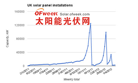 自今年4月1日起,英国对太阳能系统安装的补贴从43便士/千瓦时降低到21便士/千瓦时。自那之后的三周以来,平均每周新增的太阳能系统安装量只有2.4MW,相比去年同期的18MW下降了87%.