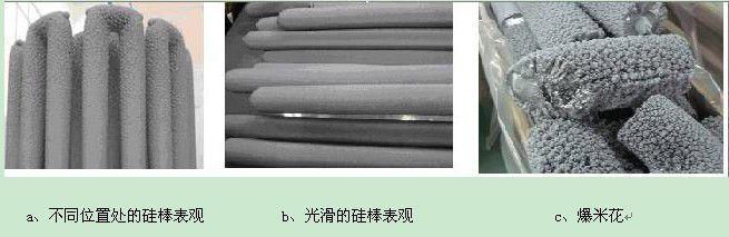 对于还原电耗的影响在产品质量方面的主要表现就是产品爆米花的大小与多少。爆米花主要是反映多晶硅表观的好坏,爆米花比较多的硅棒在化学清洗时不易处理干净,杂质和水份会残留在多晶硅表面,影响区熔成晶,甚至迫使中断拉晶操作。即使用作直拉料,也会由于杂质玷污,使单晶纯度下降。而行成爆米花的根本原因是就是炉内硅的沉积速度和硅棒表面所能吸收并使之形成晶体的速度之间的差异。当化学反应沉积速度大于硅棒表面成晶速度时,晶粒来不及在硅棒表面进行有序的排列,就会造成硅棒表面的不均匀。
