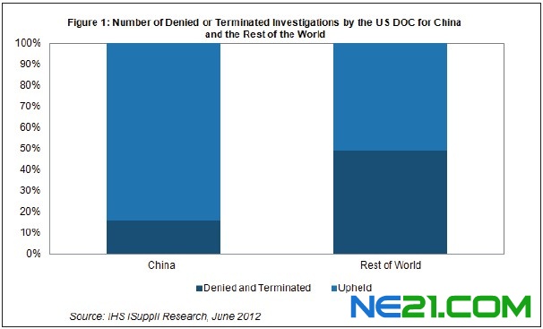 2000年以来美国商务部涉及中国以外其它所有国家的案件,约有半数被驳回或终止,意味着没有采取反倾销税以及其它任何惩罚措施。但涉及到中国的案件,只有16%被驳回或终止,如图1所示。