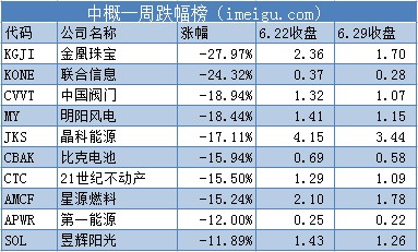 北京时间2012年7月1日,本周美股三大指数走高,i美股中概30指数从上周五664.09点跌至本周末659.31点,跌幅0.72%。以下列出的是本周中概跌幅榜跌幅前十的个股: