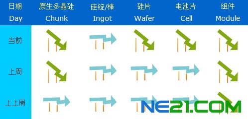 本周硅片报价弱势下滑。其中125单晶硅【均6.2¥/片 跌1.61%】,156多晶硅【均7.5¥/片 平】,156单晶硅【均9.9¥/片 跌0.5%】。近期硅片市场受下游需求影响订单不畅,且订单集中在大厂手中。由于市场对多晶硅组件需求旺盛,造成多晶硅片出货相对火热,但厂家反馈生产线仍难以满产。