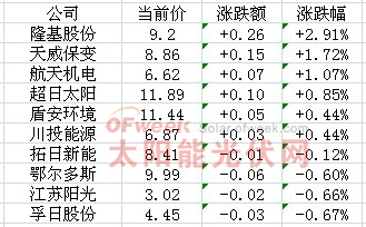 受隔夜欧美股市大幅上涨利好刺激,今日沪深两市小幅高开,早盘指数高开低走,午盘之后由于成交量制约,指数在5日均线上方维持震荡盘整,截止收盘,上证指数报收2227.31点,跌1.88点,跌幅0.08%;深成指报收9569.16点,跌38.17点,跌幅0.40%。板块方面,今日多晶硅板块小幅上涨,其中隆基股份领涨,涨幅2.91%,天威保变上涨1.72%;有研硅股领跌,跌幅0.91%,精功科技下跌0.76%。