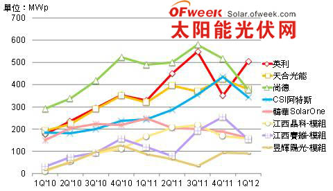 2012年第1季度德国太阳能光伏市场需求量快速攀升,超出业者预期,而美国双反诉讼定案则使得中国大陆各业者另寻策略,以避开高额征税问题。据统计大陆各厂商太阳能组件的出货量,前5大排名出现极大变动,尚德出货量大幅下降,英利则迅速攀升,前5大依序是英利、天合光能、尚德、CSI阿特斯、韩华SolarOne。而2012年以来,即便业者致力于降低周边辅材成本,与供应商议价降低成本,但太阳能产品价格持续下滑,业者于2012年第1季普遍仍亏损。