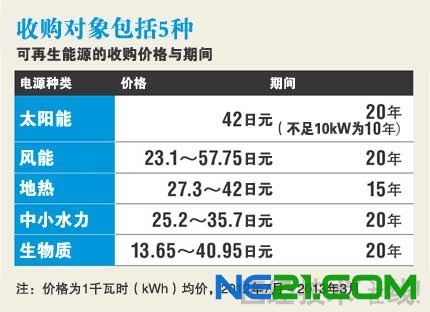 可再生能源市场到2020年将扩大到10万亿日元规模——可再生能源全量固定价格收购制度将促使电力公司扩大对于利用阳光、风力、中小水力等能源生产的电力以固定价格收购。但是,根据2012年6月18日日本经济产业省最终确定的制度,能够确保享受到有利的收购价格(如表)的,仅限于在2013年3月之前接受认证,向电力公司提出了申请的发电公司。