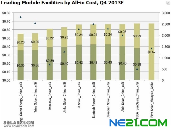 从上图中,我们可以看出中国光伏企业英利绿色能源与天合光能最具效率,他们都是成本最低的太阳能制造商;昱辉阳光、晶科能源、晶澳太阳能、尚德电力、阿特斯、Aide Solar、TBEA SunOasis以及First Solar紧随其后。