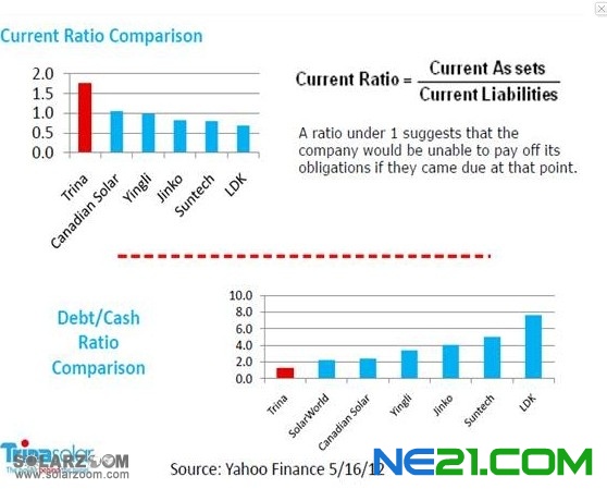 尽管这只是2013年Q4成本的预测值,但可以看出昔日“成本巨头”First Solar将跌出前十。相比于表中其他企业,它使用了不同的科技。Cadmium-Tellurium (CdTe)电池的效率更低。 让我们来看看其他光伏企业。 英利有望于2013年末成为成本最低的制造商: 1)2011年Q4,现金为6.692亿美元 2)债务23亿美元 3)分析师预测今年每股亏损0.96美元,明年每股亏损0.28美元 4)去年,鉴于资本开支高达7.69亿美元,现金流为负,总额为2.66亿美元。 天合光能: 1)现金6.325亿美元 2)债务11.4亿美元 3)分析师预测今年每股亏损1.05美元,明年每股赢利0.15美元 4)去年,现金流为正。不过鉴于净借款4.42亿美元,现金流仅为6400万美元。 从以上一个简短的调查中,我们可以看出,就这两家顶级太阳能电池板制造商(两家皆采用一体化商业模式,他们的成本优势一部分应该源于此)而言,天合光能的资产负债表相对更健康一些。因此,我们可以确定,随着产能过剩逐渐消逝以及中国光伏市场的持续扩张,天合光能有望成为在这个艰难环境中生存下去并在未来几年内蓬勃发展的光伏企业之一。