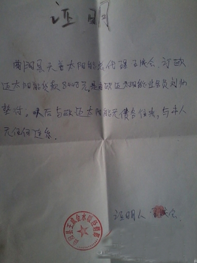 刘先生告诉,他之前是泰安市晨光太阳能有限公司的一名业务员,今年6月14日,他在河北省曲阳县认识了一位客户,出于信任,刘先生先替客户垫付了8448元的货款,客户为刘先生开具了一份《证明》,上面有客户的签字、手印和客户公司的印章。