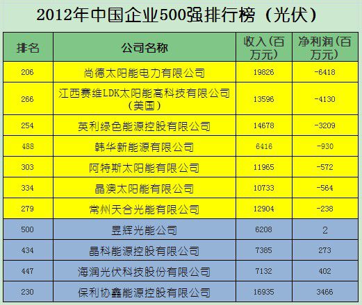 索比光伏网讯:财富中文网于北京时间2012年7月13日早全球首发2012年中国500强排行榜,中石化蝉联榜首、中石油及中国移动位居该榜第2名、第3名。此外,中国500强收入占GDP的比例继续升高;中国工商银行首次冲入前五,并成为最赚钱公司;而招商局国际有限公司首次上榜,且在净利润率排名第一。其中太阳能光伏" title="光伏新闻专题">光伏企业占得11个席位。