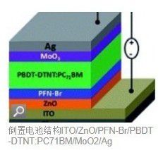 由于在传统体异质结型聚合物太阳电池采用ITO/PEDOT:PSS/BHJ/Ba(Al)结构中,酸性磺化聚苯(PSS)掺杂的聚噻吩衍生物(PEDOT)对ITO有腐蚀作用,而且铟离子的扩散会影响器件性能。在华南理工大学杨庭斌博士、华南理工大学材料学院黄飞教授、阿克伦大学龚雄助理教授等研究人员的共同努力下,通过采用倒置结构,省去了原有的PEDOT:PSS层,可以有效提高电池的稳定性。研究人员采用ITO/ZnO/PFN-Br/PBDT-DTNT:PC71BM/MoO2/Ag结构制作电池开路电压0.75V,短路电流17.4mA/cm2,填充因子61%,转化效率8.4%。