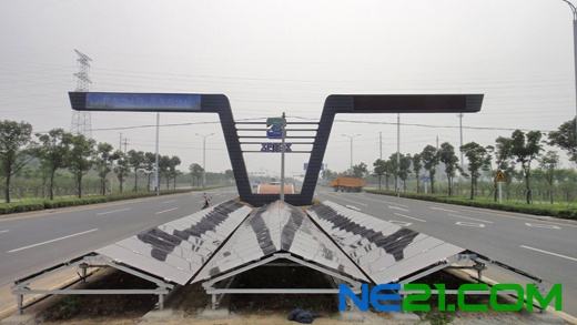 世纪新能源网讯,7月13日,作为镇江新区至扬中的金港大道公路分界标志的“凤凰展翅”大型广告牌项目竣工,圣睿公司承担了为广告牌提供电力的太阳能电站部分的项目总包任务,这是圣睿公司继太阳能小屋后承接的镇江新区又一标志性项目。
