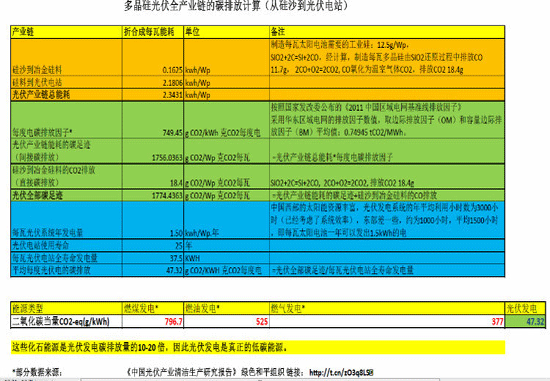 经计算,从多晶硅光伏全产业链(硅沙-光伏电站系统)来看,平均每度光伏发电的碳排放仅为47.32 g CO2/KWH, 约为传统化石能源发电的10-17分之一,因此光伏发电是真正的低碳能源。