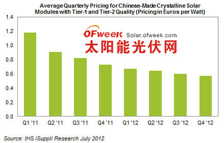 iSuppli公司在其最新的光伏电池及组件生产市场跟踪报告中写道,虽然2012年下半年晶体硅组件市场平均价格会有纾缓,但预计仍然会有所下降。六月底,据其报告显示组件价格为0.64/ W,并预计中国一二线厂商组件的价格将于年底将下降到0.57欧元。组件价格环节主要归因于全球装机容量的增加和台湾电池的高需求改善。