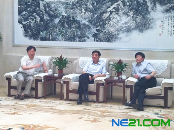 图为:朱共山董事长向于广洲署长汇报曹新平书记陪同