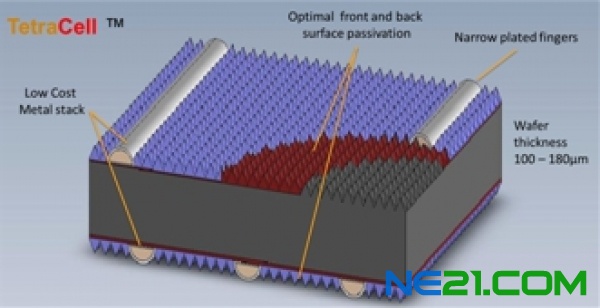 TetraSun电池概念的基础是被该公司称为“创新表面钝化技术”。使用了40um宽的铜电极而非宽幅印刷银金属。生产流程无需使用特殊设备,电池Voc值超过700mV的成果是在单晶CCz培养硅上实现的。