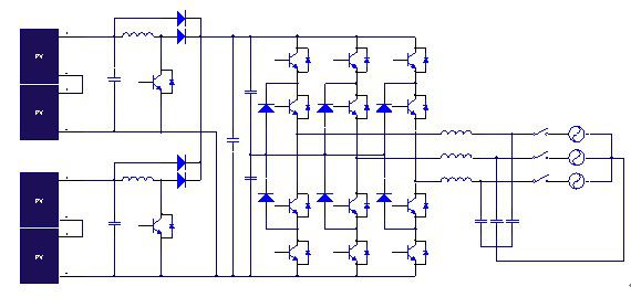 事实上,要使太阳能逆变器的效率提高 1%非常困难,然而由于系统设计不当,而导致发电效果降低10%的情况,却并不少见,有些甚至可能导致系统无法长期正常运行。从这个事实出发,对逆变器设计提出了新的要求,即满足更加灵活的系统配置。在单路MPPT追踪的情况下,所有的PV组件串接起来,接入逆变器,如果组串中有PV组件失效情况发生,则该路的整体MPPT效率会受到影响,从而有可能使得系统的效率大大下降,无论逆变器有多高的转换效率和追踪效率,都无法发挥作用。为了减少这种失效带来的系统效率降低的风险,户用型小功率逆变器出现了多路独立MPPT追踪的技术趋势,多路MPPT能够减小单路MPPT失效带来的损失,给系统的配置带来了更大的灵活性。图2为一种2路MPPT独立追踪的三相三电平并网逆变器电路拓扑图