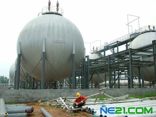 在原料罐区,十多个巨大的球罐主体建设已完工,在阳关下闪耀着耀眼的光芒。靠北边的两个罐在进行最后的处理,工人正在进行焊接、除锈,做防腐、防化层,最多十天,整个原料罐建设就全部完工。