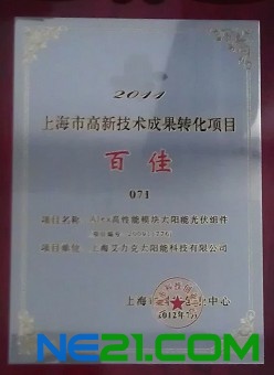 世纪新能源网讯,经上海市科技创业中心认定,艾力克光伏组件荣获2011年度上海市高新技术成果转化项目“百佳”荣誉称号。