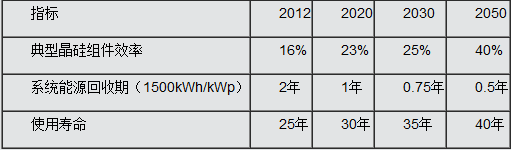 索比光伏网讯:典型商业晶硅组件的效率期望能从2010年的16%增长到2030年的25%,2050年增长到40%。随着能源和材料在制造业的使用更加高效,光伏系统能源回收期的时间会不断缩短的。预计能源回收期会从2010年的两年降低到2030年的0.75年,到2050年会下降到0.5年。使用寿命期望从25年增加到40年。(作者:和海一样的新能源)