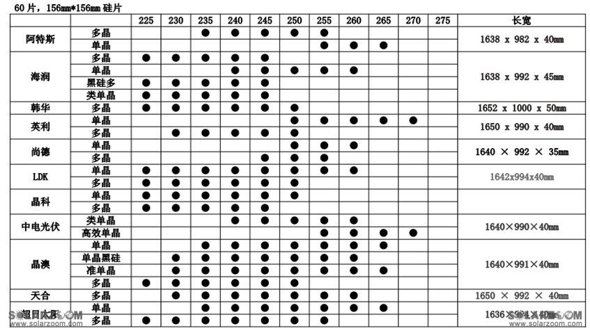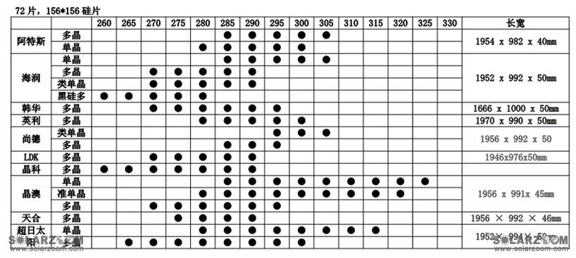 注:上表中,第一行为每张单晶硅片和多晶硅片的价格差,价格差=多晶硅片价格—单晶硅片价格,单位:元/张。第一列为60片156*156硅片的组件峰瓦,单位:W。主表中的数据为每张单/多晶硅片价格差对应到相同W数组件后的价格差,单位:元/W。阴影部份为国内未量产的,目前国外顶级水平的60片的组件中已能生产最高325W的组件。