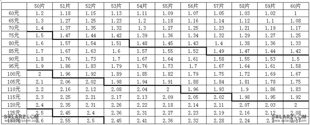 注:表格中,第一行为每千克方棒的出片数,单位是片,第一列为单晶方棒和多晶方锭间的加工差,加工差=多晶方锭加工费/千克-单晶方棒加工费/千克,单位:元/千克。主表中的数据为每千克硅锭加工费差对应的每张硅片的价格差,计算方法:硅片价格差=硅锭加工费差/单位出片数,单位:元/张。156*156硅片。(加工费只指材料,人工,水电,不算折旧费用的)