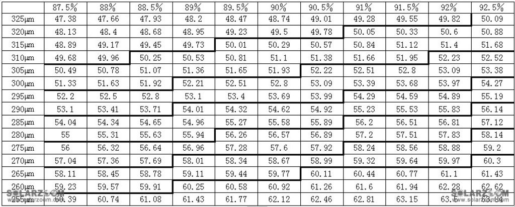注:下表中第一行为切片的成品率,第一列为切片的槽距,单位是微米。主表中的数据为每千克方锭的出片数(为计算方便单晶多晶都以每千克17.6mm来计算,计算方法:出片数=17.6/槽距*成品率)。事实上由于倒角的原因,同样槽距和成品率每千克单晶可以比多晶多切几片。.