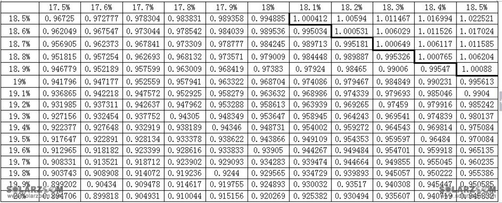 注:上表中,第一列是单晶的转换效率,第一行是多晶的转换效率。主表数据为电池瓦数比。计算方法:电池瓦数比=多晶转换率*多晶面积/(单晶转换率*单晶面积),本表可以对比到最终组件,但是要考虑单晶和多晶的封装损耗是有差异的。