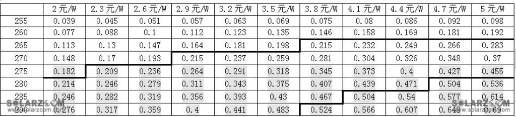 (2)如下表所示,以多晶60片156*156的250W为基础,第一列为单晶同样面积的组件的瓦数,第一行为其它相关成本,单位为元/W,主表中数据为合理溢价差,单位元/W。(忽略不同品牌间的溢价差)