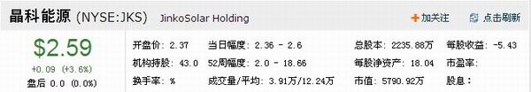晶科能源有限公司是中国领先的光伏产品制造商,注册资金1.9亿美元,是(香港)栢嘉科技有限公司全资创办的外资企业。业务营销网络涵盖北美,欧洲以及亚洲。公司员工总数约2500余人,生产基地位于江西省以及浙江省,生产设备面积总占670000平方米。公司的全球营销中心位于中国上海,并且正在荷兰的鹿特丹筹备完善海外仓库。晶科能源于2010年5月14在美国纽约证券交易所成功上市,发行价为每ADS11美元,筹资总额达到6418万美元。1ADS=4普通股。