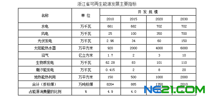 浙江省发改委昨日发布十二五及中长期可再生能源发展规划的通知,对水能、风能、太阳能、生物质能、地热能以及海洋能等各种能源条件做出统计,并给出到2030年为止的各种可再生能源发展目标。