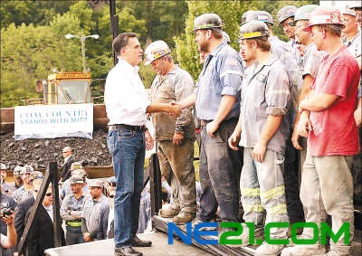 8月14日,共和党总统候选人罗姆尼访问了俄亥俄州的一座煤矿。煤矿坐落在葱绿的阿巴拉契亚山谷中。面对着头戴安全帽、身穿井下工作服的矿工们,罗姆尼称,奥巴马正在发起“煤炭战争”,而这对矿区人民来说是严峻的挑战。他说:“我们有够用250年的煤炭,为什么要放着不用呢,我们要考虑到自身的能源优势,以挽救就业,并创造更多就业机会。”