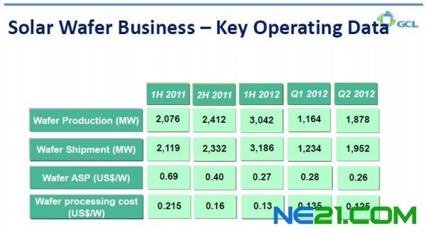 该公司报告,多晶硅产量继续上升,提高了109.8%,达到25,233MT,去年同期为12,026MT。2012年上半年硅片产量显著提升,达到3,042MW,比2011年前六个月的2,076MW上升46.5%。