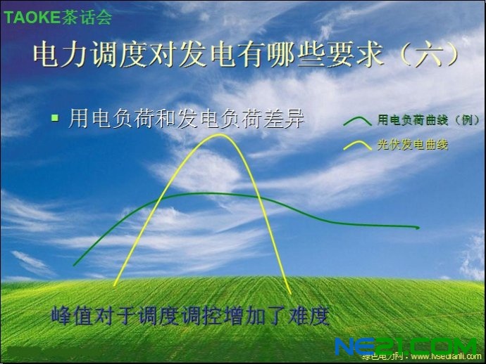 1、光伏和柴油发电机的区别是:光伏并网发电不是根据用户负载大小来自动调节发电负荷,它是要最大限度将光伏电池板能量取出才可以保证经济性。因此光伏发电曲线和光照强度曲线是一致的,是一根抛物线形曲线,有峰值存在。