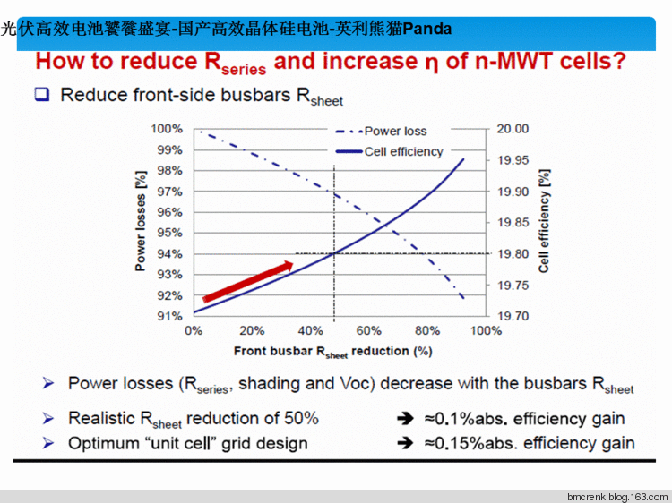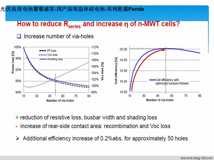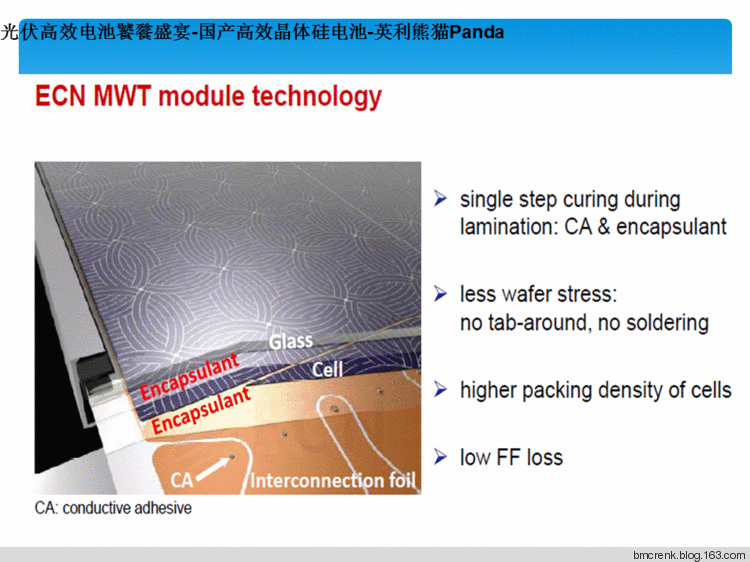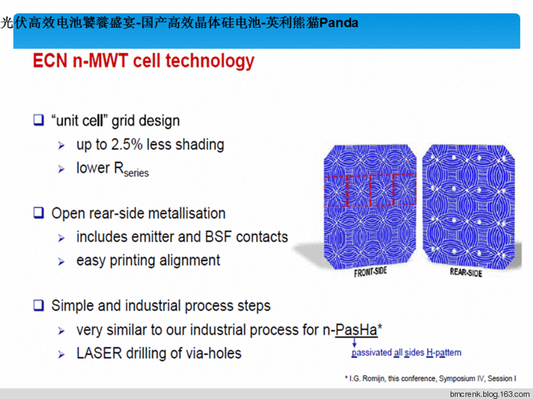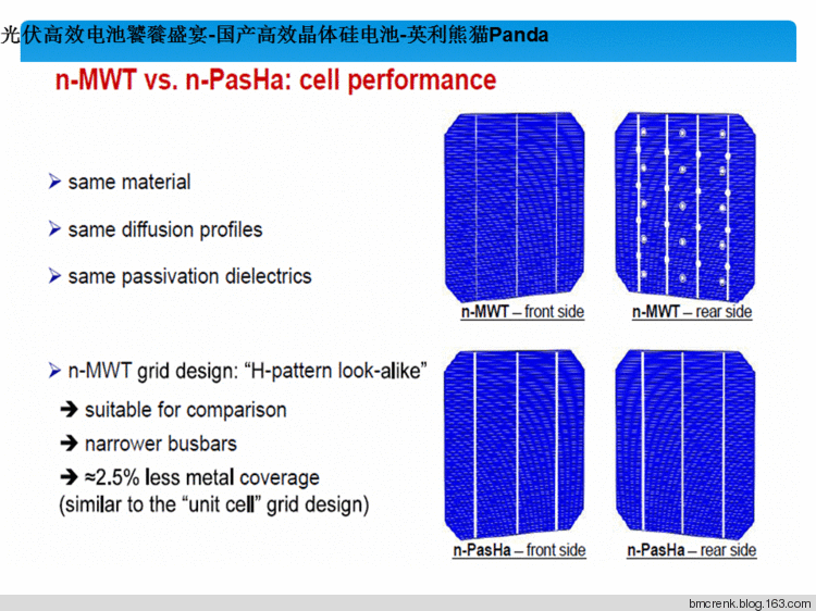 “熊猫”电池拥有丰富的技术元素。是N型双面电池技术和MWT金属缠绕式(metallisation Wrap-Through,简称MWT)电池技术的集成。ECN研究中心于2009年研发成功MWT电池技术可以得到17%的多晶硅组件转化效率,创下当时的一个记录,理论上这种技术可以达到25%的综合效率。这种电池技术将主栅线从传统的正面转移至背面,正面只保留细金属栅线,因此降低表面栅线遮挡损失,因此又被称作背电极电池。