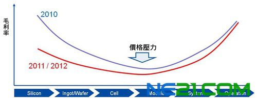 各大研调机构指出,从上游的多晶矽/晶圆(Wafer),到中游的电池制造(Cell)/模组(Module),各阶段的全球加总年产能约为50GW,而2011年全球太阳能系统装置量仅为26.5GW,明显跟不上业者的扩产速度。2011年太阳能产品陷入削价竞争的惨烈遭遇,正肇因于扩产竞赛引起的产能过剩。