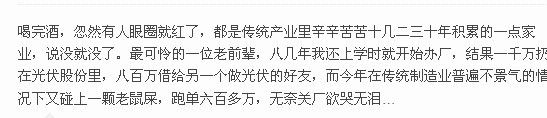一个企业倒闭的光伏人“落寞天涯_怀念大碗喝酒的日子”自称“不靠谱老板”,不禁在微博上诉苦: