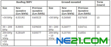 欧洲 保加利亚 目前保加利亚的重点开始转移至可再生能源的使用,尤其是住宅型太阳能光伏系统的发展。根据官方资料,该国在截至2012年6月份的过去一年中安装了500-600MW的可再生能源系统。 政策 保加利亚的FIT政策追随德国、意大利等其他欧洲市场,将从9月开始对新建的太阳能发电站给予30%的补贴削减,但目前尚未给出官方资料。 在今年6月份该国政府已经削减了一半补贴,并被建议削减屋顶大型光伏系统补贴的35%,地面电站的28%补贴。以下是最新的FIT资料: