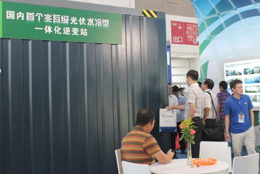 本次展出的箱式电站是国内首个兆瓦级光伏水冷型一体化逆变站,其内部可根据实际需要集成2台1MW或1.25MW光伏并网逆变器,最大功率可达2.5MW;水冷散热技术大大提高了产品的功率密度、防护等级以及电磁兼容性能,使之更适应于高海拔、超低温、强沙尘、沿海等恶劣应用环境;一体化集约设计及全状态信息监控大大提高了产品的可靠性,有效降低了大型荒漠电站的安装及维护成本。